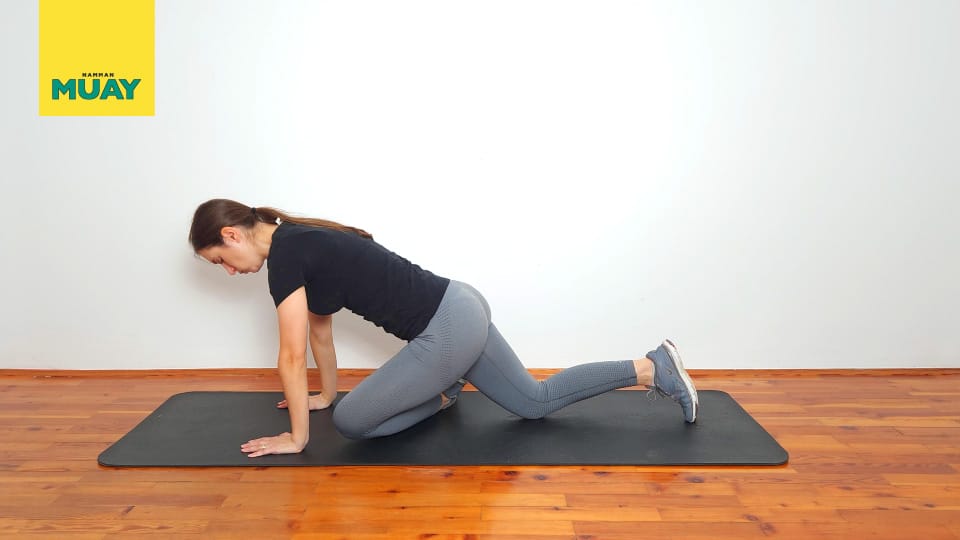 Mettiti a terra in posizione di quadrupedia. Porta una gamba all'indietro e solleva la gamba che vuoi allungare, piegando il ginocchio verso l'alto e attraverso il corpo.